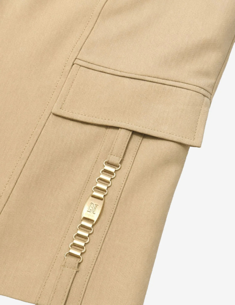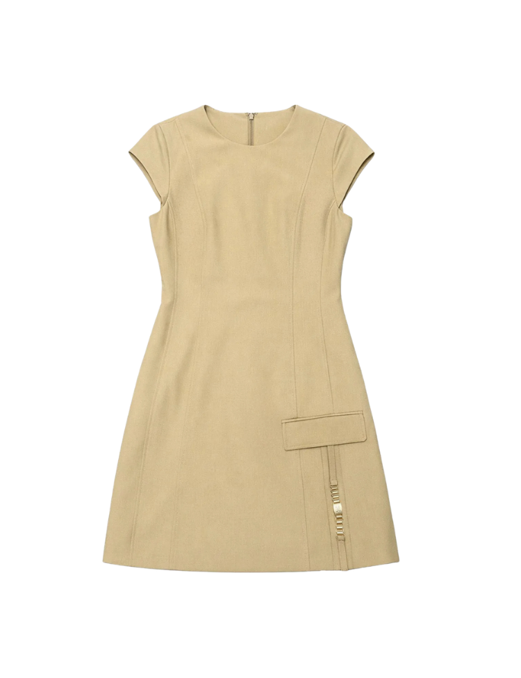 Deze korte jurk in travertine valt op door zijn strakke lijnen en doordachte details. De getailleerde pasvorm volgt je figuur mooi, terwijl de korte mouwen en ronde halslijn zorgen voor een vrouwelijk silhouet. Aan de voorzijde is een decoratief zakje verwerkt met daaronder een verticale band met goudkleurige hardware en het N logo. Zichtbare siernaden accentueren het structured design. De jurk heeft een rits aan de achterzijde. Het stevige materiaal houdt zijn vorm en zorgt voor een verzorgde uitstraling.