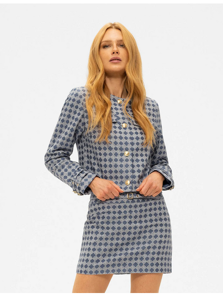 Kort jasje in misty blue met jacquard logo dessin over de gehele stof. Het jasje heeft een ronde halslijn en sluit met goudkleurige knopen met het N logo. Twee borstzakken met klep en logo knopen. De mouwen zijn voorzien van knoopsluiting aan de manchet. De korte snit valt net boven de taille en heeft een getailleerde pasvorm. De jacquard structuur van het all over N patroon geeft de stof extra textuur. Combineer dit jasje van Nikkie met de bijpassende rok voor een complete look.