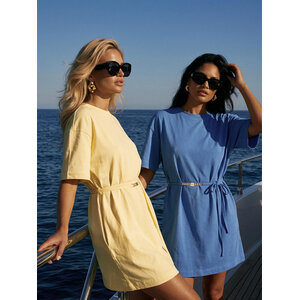 Kleur: Ultra marine blauw Sluiting: Strikceintuur met goudkleurig schakeldetail Design: Oversized t-shirt jurk met ronde hals en halflange mouwen Lengte: Boven de knie Artikelnummer: N 5-174 2603
