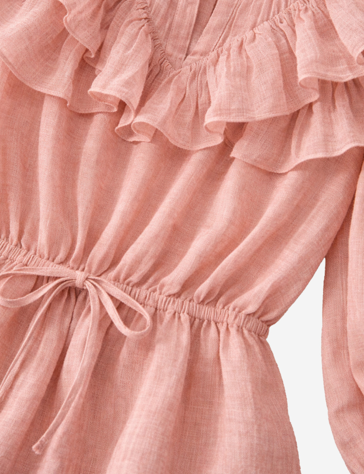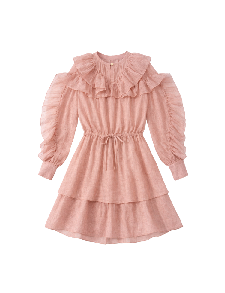 Deze jurk van Nikkie in blush is uitgevoerd in licht doorschijnende, luchtige stof met een subtiele structuur. De ronde halslijn is afgewerkt met meerdere volantlagen die extra volume creëren. De lange mouwen zijn versierd met ruches langs de naden en lopen af naar een elastisch manchet. De taille wordt geaccentueerd door een tunnelkoord met strikdetail. De gelaagde rok valt tot net boven de knie en heeft een speelse uitstraling door de volantbanen.