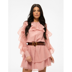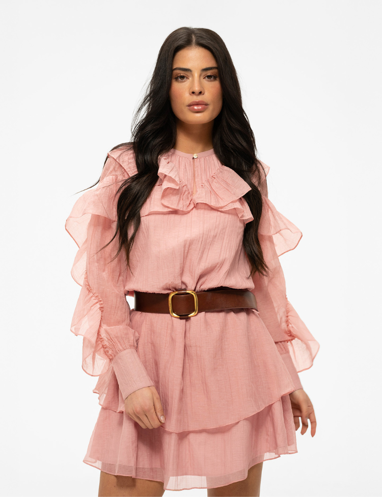 Deze blush jurk draag je met een brede riem in een contrasterende kleur om je taille extra te benadrukken. De luchtige stof en vrouwelijke volants maken de Nikkie jurk geschikt voor verschillende gelegenheden. Combineer met minimalistische accessoires om de focus op het ontwerp te houden.