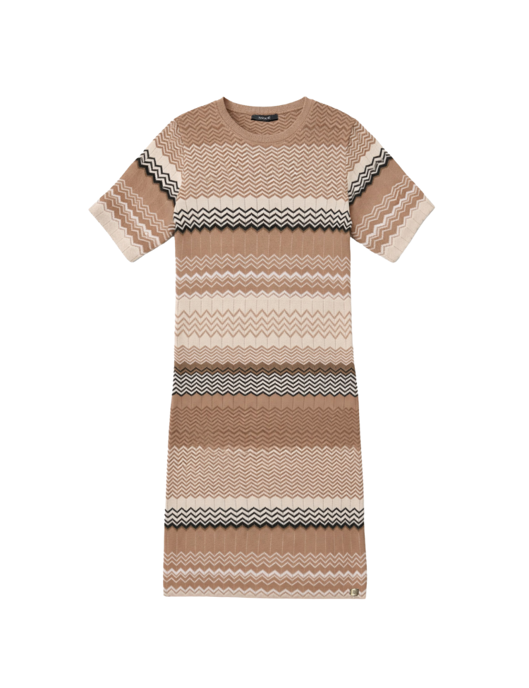 Deze gebreide jurk van Nikkie heeft een grafisch zigzagpatroon in warme travertine, beige, bruin en zwart tinten. De korte mouwen en ronde hals zorgen voor een relaxte uitstraling. De rechte pasvorm valt net boven de knie. Het stretch materiaal heeft een fijne ribstructuur die de zigzaglijnen mooi benadrukt. De jurk is volledig gevoerd en heeft een soepele draagkwaliteit.