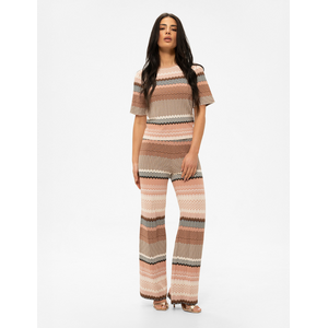 Deze gebreide broek van Nikkie heeft een wijde, flared pijp en een elastische tailleband met bijpassend koord. Het zigzagdessin loopt in horizontale strepen in blush, bruin, zwart en zandtinten. De pantalon is gemaakt van een soepele tricot kwaliteit met een fijne ribstructuur. De lange pijpen vallen recht naar beneden en zorgen voor een verlengd silhouet. De zachte breikwaliteit draagt comfortabel en houdt mooi zijn vorm.