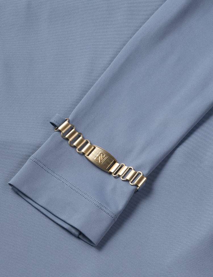Deze Nikkie body in misty blue heeft lange mouwen en een ronde halslijn. De aangesloten pasvorm zorgt voor een gestroomlijnd silhouet. De mouwen zijn afgewerkt met een goudkleurige N-logo sluiting aan de manchetten, een subtiel detail dat het item een verzorgde uitstraling geeft. De body heeft een drukknopsluiting onderaan voor een perfecte pasvorm en gemak. De soepele stretchstof beweegt comfortabel mee en houdt zijn vorm goed.