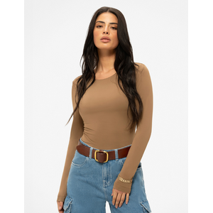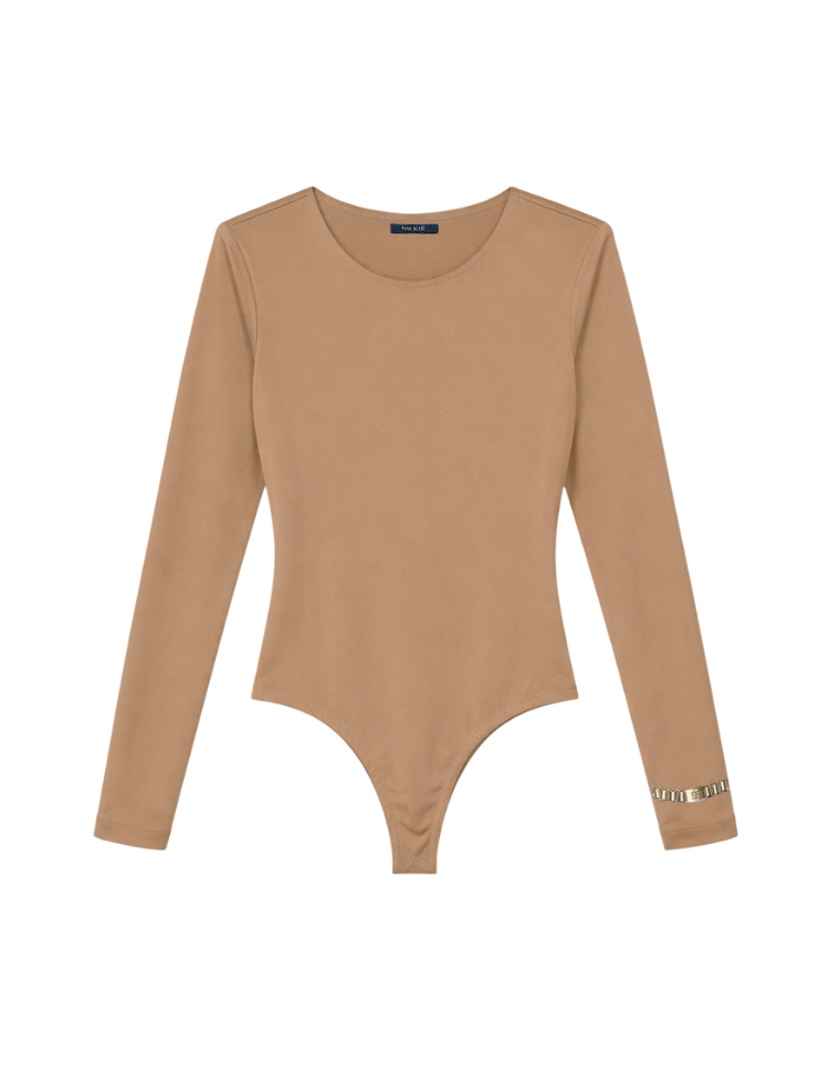 Deze body in walnut bruin is gemaakt van soepele stretchstof met een gladde afwerking. Het item heeft lange mouwen met een bijzonder detail: een goudkleurige siersluiting met de letter N op de manchet. De ronde halslijn en aangesloten pasvorm zorgen voor een gestroomlijnd silhouet. De body sluit met drukknopen aan de onderkant. Het warme bruintintje combineert makkelijk met donkere en lichte kleuren.