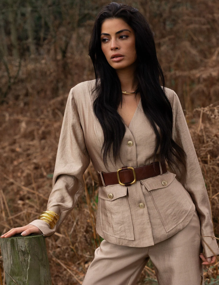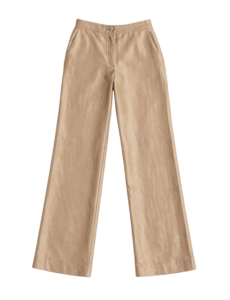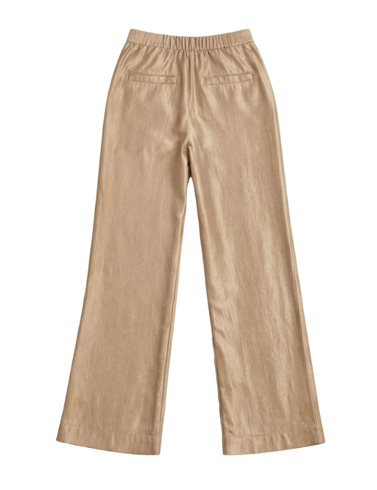 Deze wijde broek van Nikkie heeft een vloeiende, goudkleurige stof met een subtiele metallic glans. De rechte, brede pijpen vallen strak van de heup en lopen door tot op volledige lengte. De hoge taille geeft de broek een gestroomlijnd silhouet. De stof heeft een licht glanzende textuur die het travertine-goudtint versterkt.