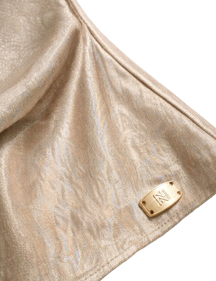 Mouwloze top in een warme travertine tint met subtiele glans. De ronde halslijn en korte schouderpassen geven een gestructureerde uitstraling. Een brede strikceintuur in dezelfde stof accentueert de taille en creëert een vrouwelijk silhouet. Aan de zijkant een klein goudkleurig plaatje met logo. De top heeft een lichte glans door het gekozen materiaalgebruik, wat zorgt voor een geraffineerde finish. Perfect te combineren met de bijpassende pantalon voor een complete, samengestelde look.