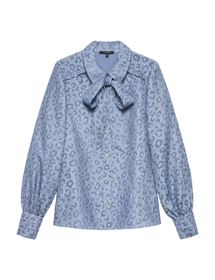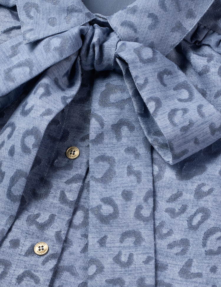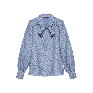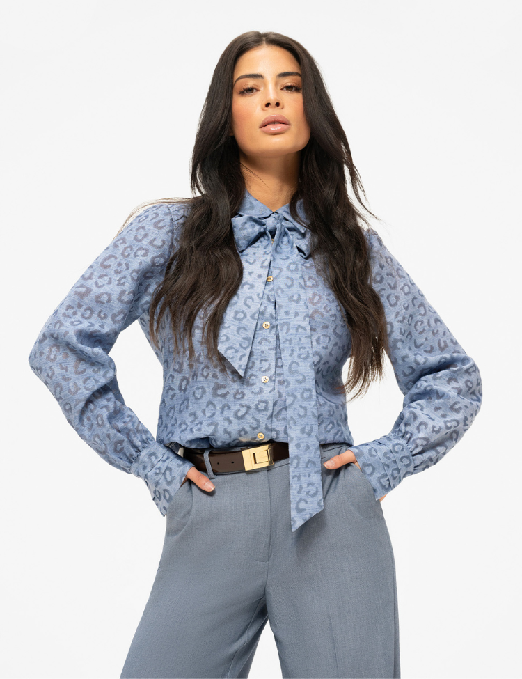 Deze blouse van Nikkie is uitgevoerd in een subtiele blauwe tint met een leopardprint in donkerder tinten. De blouse heeft een klassieke kraag met een afneembare strikdetail. De doorlopende knoopsluiting is afgewerkt met goudkleurige knopen. Lange mouwen met manchetten met knoopafwerking zorgen voor een verzorgde finish. De lichte transparantie van de stof voegt een speelse dimensie toe aan de damesblouse.