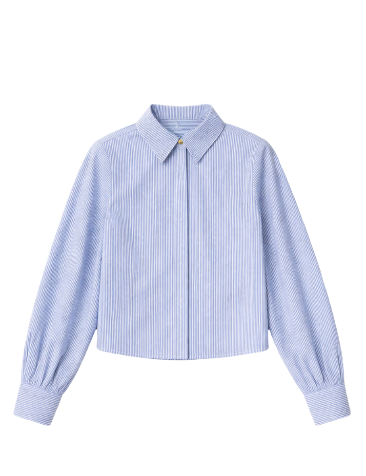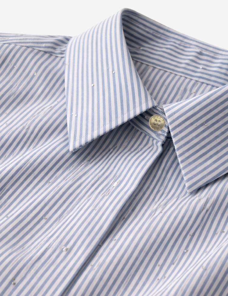 Blauwe gestreepte blouse met een klassieke hemdkraag en verborgen knoopsluiting aan de voorkant. De blouse heeft ballonmouwen met brede manchetten, afgesloten met goudkleurige knopen. Over de stof zijn subtiele kristalletjes verwerkt die het streepdessin een verfijnde touch geven. Aan de achterzijde is een plooi verwerkt voor extra bewegingsruimte. Een cropped model met een rechte zoom.