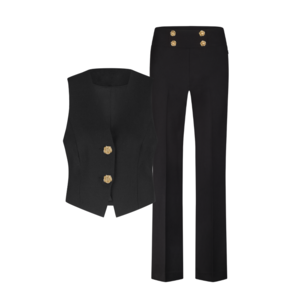 De Nikkie Waistcoat Combi-set combineert vrouwelijkheid en klasse in één stijlvolle look. Het gilet heeft een getailleerde pasvorm met luxe goudkleurige knopen en een elegante V-hals. De pantalon valt mooi recht en zorgt voor een flatterend silhouet, afgewerkt met vier gouden knopen voor een chique detail.