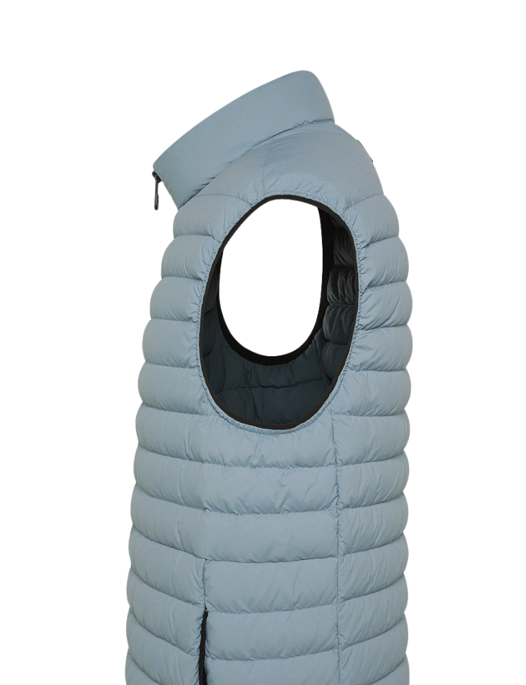 De buitenlaag en voering zijn van 100% polyamide, met een vulling van 80% dons en 20% veertjes (Fill Power 650). De bodywarmer mag gewassen worden op maximaal 30°C met een mild programma. Drogen op lage temperatuur is toegestaan, strijken tot 110°C. Niet bleken of chemisch reinigen. Plat laten drogen in de schaduw.