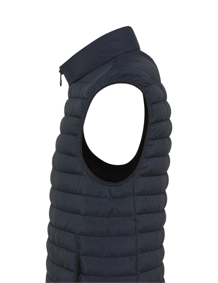 De Peuterey Moise 02 is een licht gewatteerde bodywarmer gevuld met natuurlijk dons en uitgevoerd in ultralicht 20 denier nylon met een subtiel glanzende afwerking. Het model heeft een opstaande kraag, een zwarte ritssluiting met dubbele trekker in contrasterende kleur en handige zijzakken met rits.