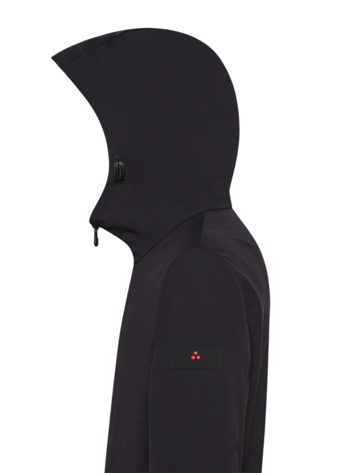 Het ontwerp is clean en minimalistisch, met een vaste capuchon voorzien van verstelbare trekkoorden, een zwarte dubbelzijdige ritssluiting en ruime zijzakken. Dankzij de regular fit en ongevoerde afwerking behoudt de jas zijn lichte draaggevoel, terwijl de stretchstof zorgt voor voldoende bewegingsvrijheid.