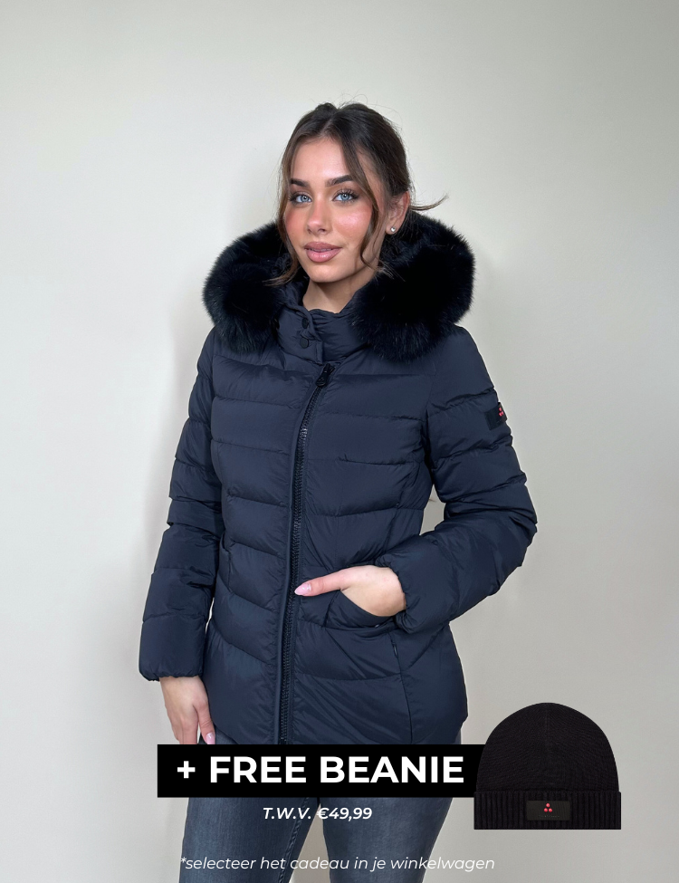 De jas is gevuld met gecertificeerd natuurlijk dons (80% dons, 20% veren, Fill Power 650), wat optimale warmte en lichtheid biedt. De capuchon met afneembare vossenbontkraag voegt een elegante, verfijnde uitstraling toe. Dankzij de asymmetrische ritssluiting, verborgen drukknoopsluiting bij de zakken en de vrouwelijke slim fit heeft de jas een moderne en flatterende look. Bovendien is de buitenlaag waterafstotend, waardoor de jas ideaal is voor koude en natte winterdagen.