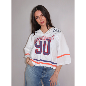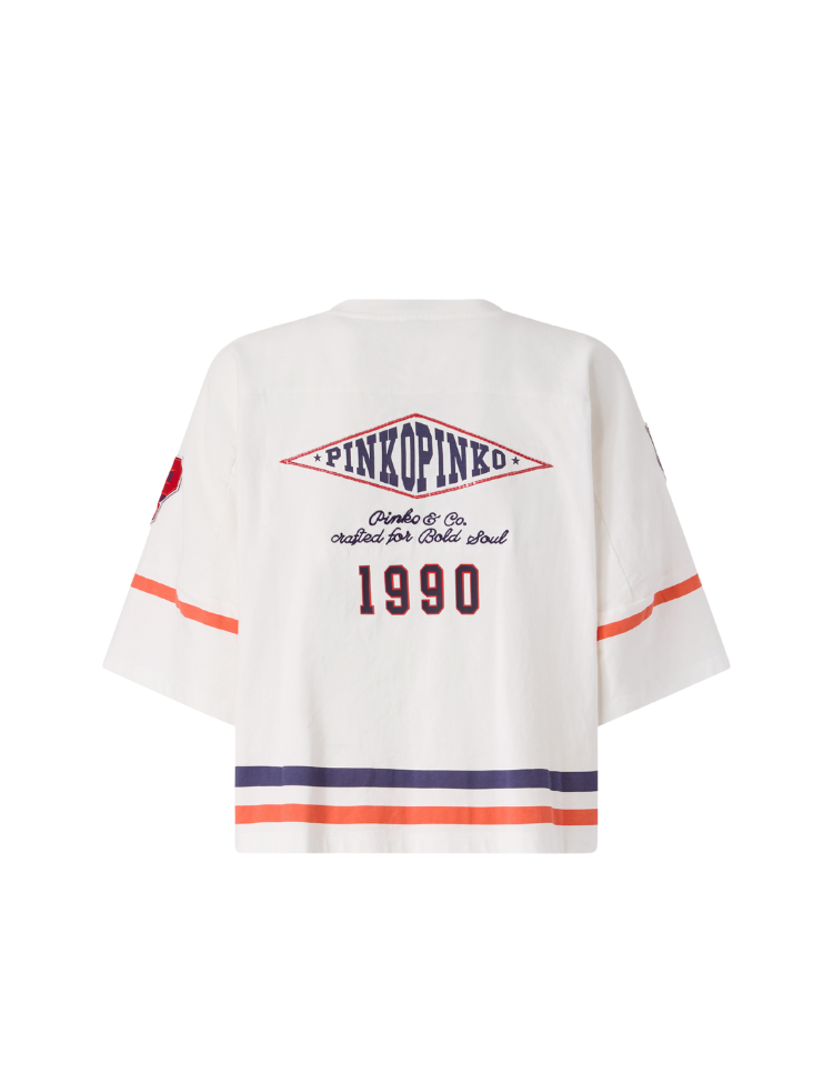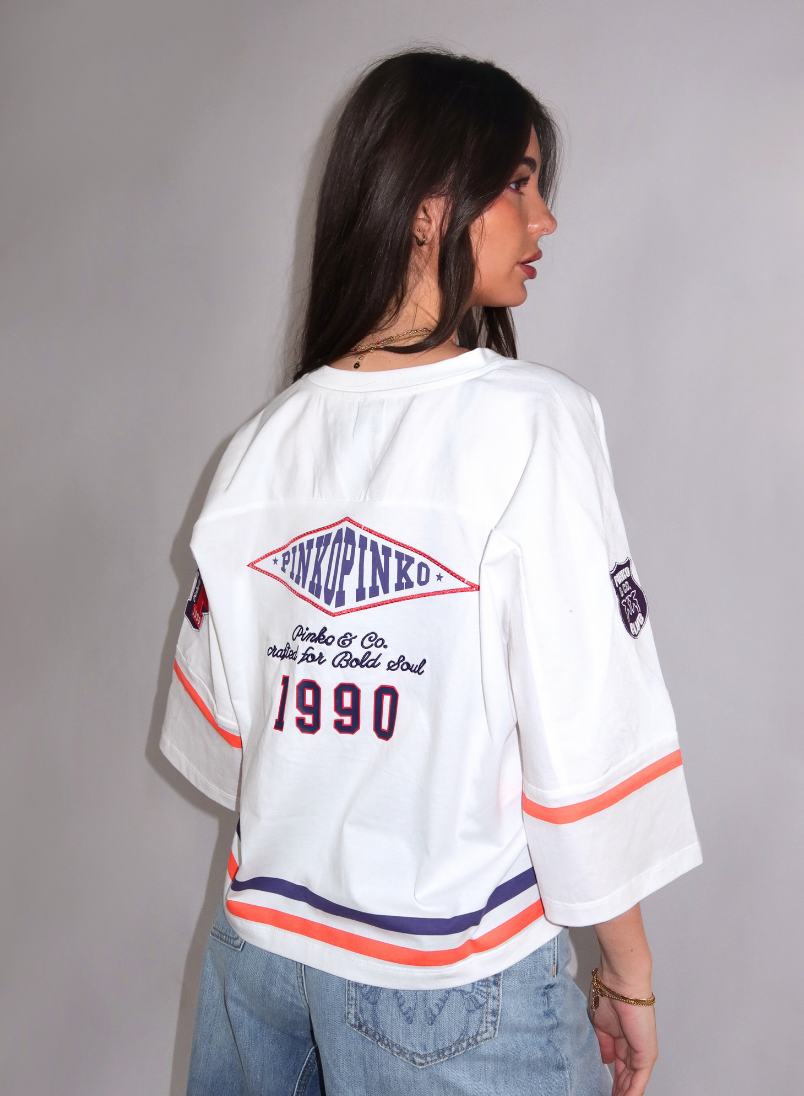 Een oversized top in wit jersey met twill details en een sportieve twist. De V-hals en wijde pasvorm zorgen voor een relaxte uitstraling. Aan de voorzijde vind je het cijfer 90 met de tekst Bold Soul, aan de achterzijde het logo PINKOPINKO met Pinko & Co. crafted for Bold Soul en het jaartal 1990. De schouders zijn versierd met het opschrift Pinko in donkerblauw. Horizontale strepen in oranje en donkerblauw lopen rond de taille en mouwen. Het korte mouwtje eindigt net boven de elleboog. De stof voelt zacht aan en heeft bewegingsvrijheid.