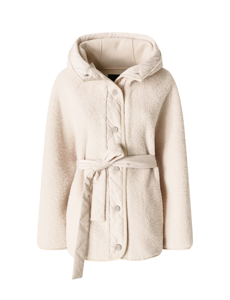 De jas is afgewerkt met een doorgestikte sluiting met drukknopen en een ruime capuchon, wat zorgt voor zowel warmte als een nonchalante, moderne look.