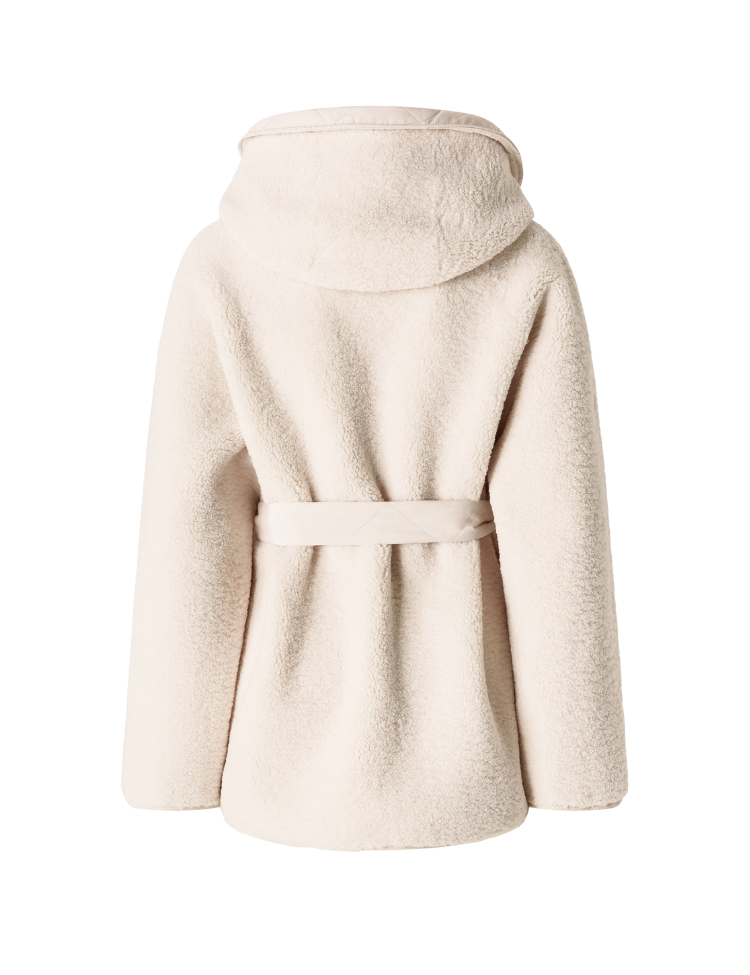 De Pinko Capperi Caban Jacket is een luxueuze jas in zachte swan white teddy-stof. Het korte caban-model combineert comfort met een chique uitstraling en wordt geaccentueerd door een afneembare tailleceintuur, waardoor je de pasvorm naar wens kunt tailleren.