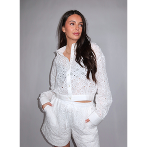Draag deze broderie blouse met de bijpassende witte short voor een toonop toon look. De open structuur van de stof creëert speelse transparantie. Pinko vertaalt dit seizoen romantische details naar een hedendaagse outfit.
