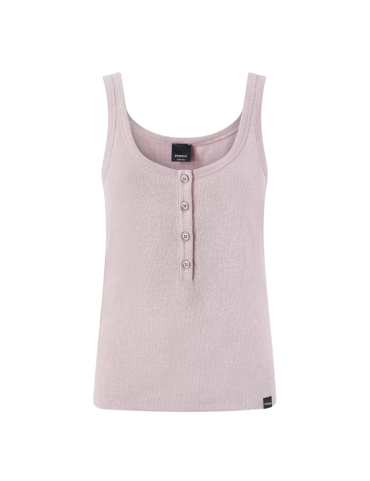 De Pinko Chimera Tanktop is een gebreide top met metallic effect door een speciaal garen dat in de stof is geweven. De slanke pasvorm met dunne schouderbandjes wordt vergezeld door een rij metalen knopen aan de voorkant. Dit vest is ideaal om onder een jasje te dragen en geeft je outfits, zelfs formele outfits, een speciale sprankelende touch.