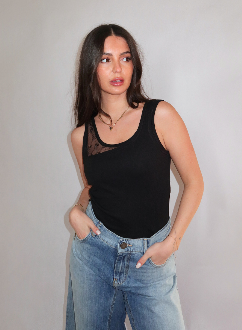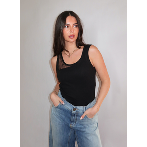 Deze zwarte top van Pinko heeft een fijngeribde structuur en een aangesloten pasvorm. Het topje met brede schouderbandjes heeft een asymmetrisch detail van transparante tule met logoprint aan de voorkant. De ronde hals en gladde afwerking geven het item een verzorgde uitstraling. Het stretch ribkwaliteit zorgt voor een comfortabele fit die het silhouet mooi volgt.