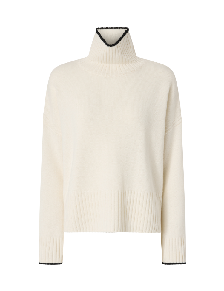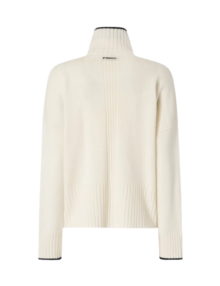 De Pinko Falkland Maglia is een luxueuze coltrui, vervaardigd uit een zachte mix van merinowol en kasjmier. Uitgevoerd in de verfijnde tint Meringue White biedt deze knit zowel warmte als elegantie. Het design heeft een ontspannen pasvorm met brede ribboorden en een hoge col, die subtiel is afgewerkt met een contrasterend zwart randdetail voor een moderne twist.