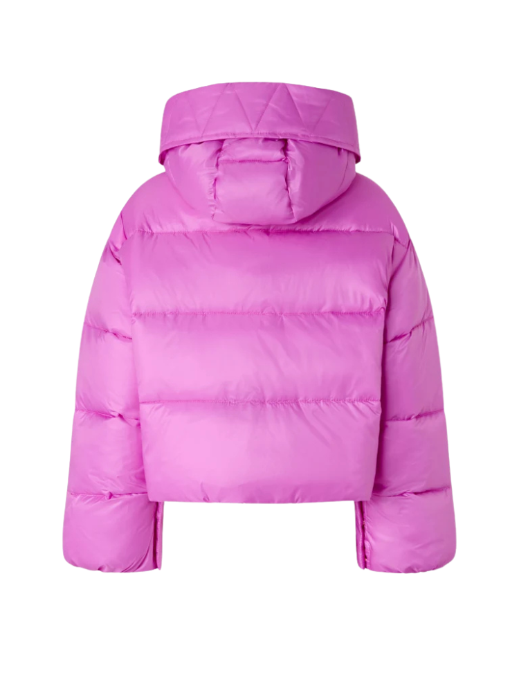 De Pinko Impasto Imbottito Tela Technica Jacket -in Purple-Byzantium is een stijlvolle donsjas van gewatteerde technische stof met een subtiel glanzende finish. Deze jas heeft een grote, comfortabele capuchon met verstelbaar koord en handige verticale steekzakken. De metalen drukknoopsluiting zorgt voor een moderne touch. Dankzij de cropped fit is deze puffer perfect voor elke dag — ideaal om de eerste koude dagen van het seizoen stijlvol te trotseren.