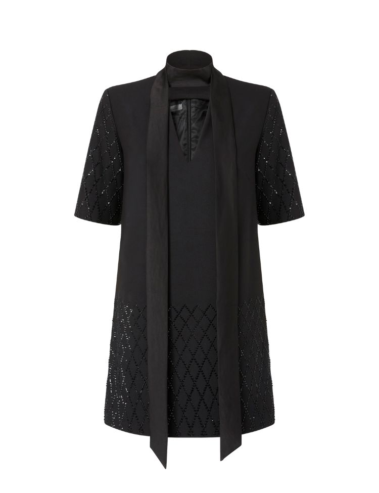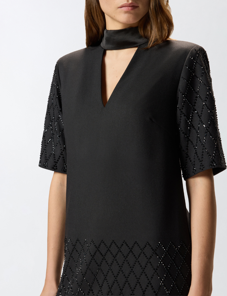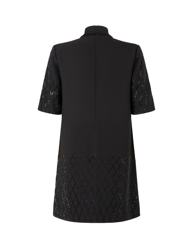 De Pinko Lipogramma Abito in nero limousine is een verfijnde jurk met een moderne, elegante uitstraling. Gemaakt van een hoogwaardige poly-viscosemix, biedt deze jurk een comfortabele pasvorm met een luxueuze finish. De korte mouwen en onderzijde zijn gedecoreerd met een diamantvormig patroon van glinsterende applicaties, wat zorgt voor subtiele glamour.