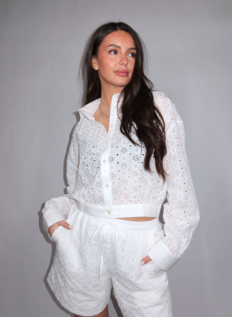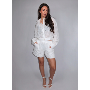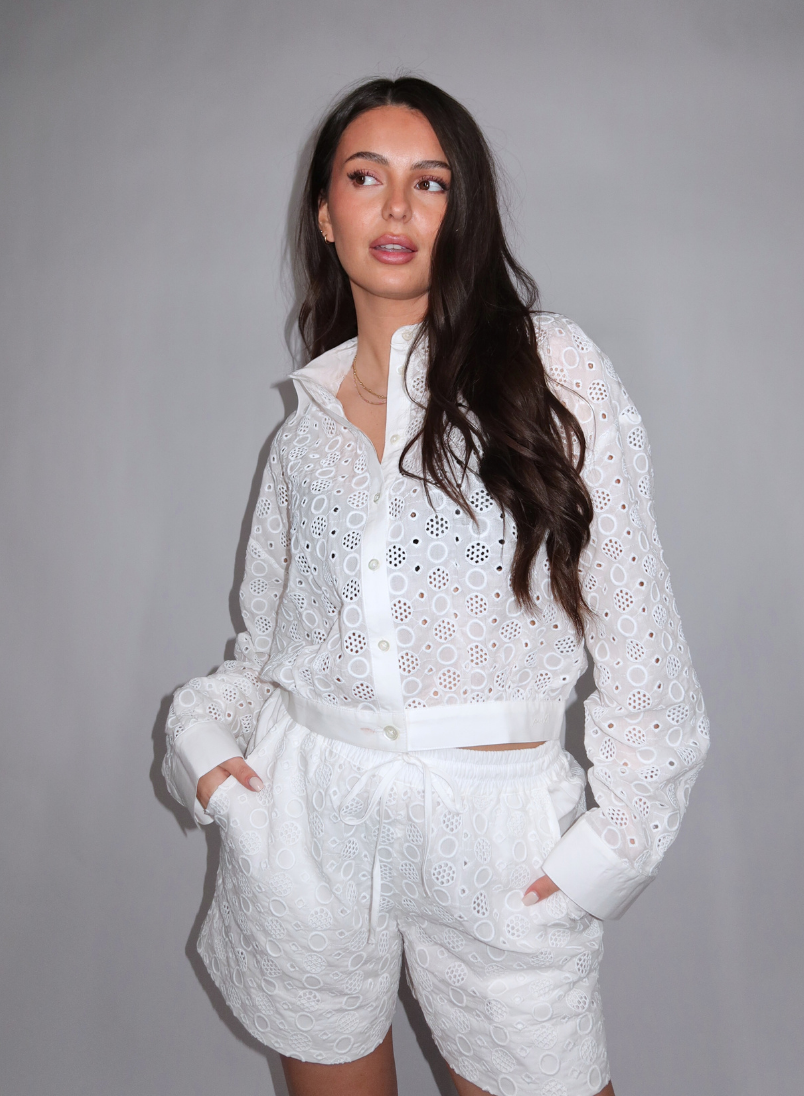 Deze witte short van popeline heeft een rijke broderie anglaise over de hele stof. Het borduurwerk toont een reliëfachtig patroon met cirkel- en bloemmotieven. De short heeft een elastische tailleband en steekzakken aan beide zijden. De pijpen zijn recht gesneden en vallen net boven de knie. De stof is een katoenmix met een geweven structuur. Het geheel heeft een zachte textuur en fris wit kleureffect.