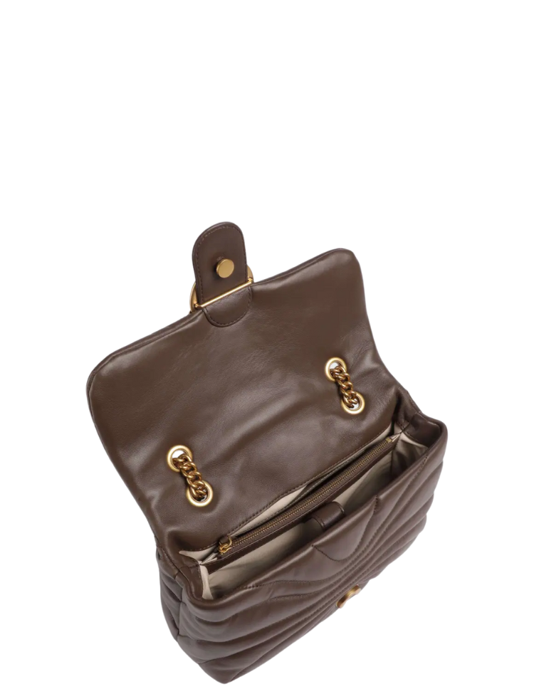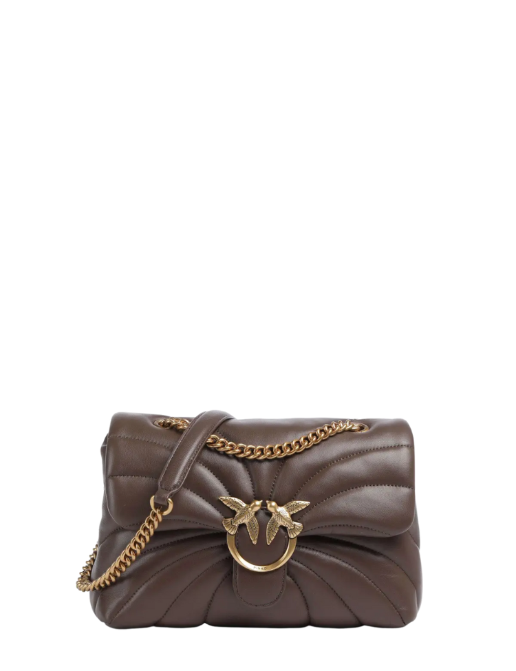 De Pinko Love Classic Puff CL Sheep Nap straalt luxe en elegantie uit. Deze prachtige schoudertas is uitgevoerd in zacht schapenleer in de kleur Marrone Castano en afgewerkt met goudkleurige vintage details. De iconische Love Birds gesp maakt het design direct herkenbaar.