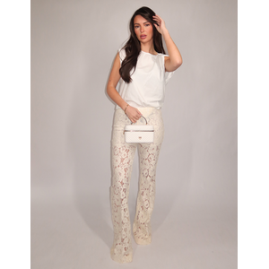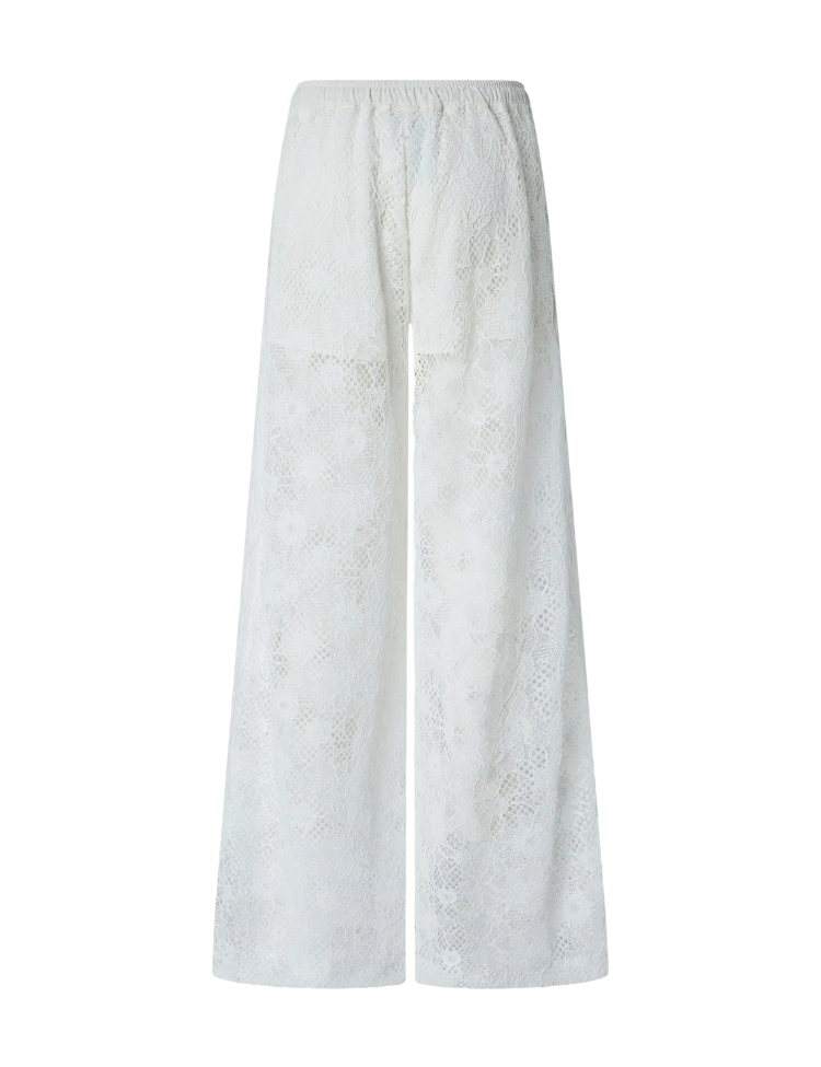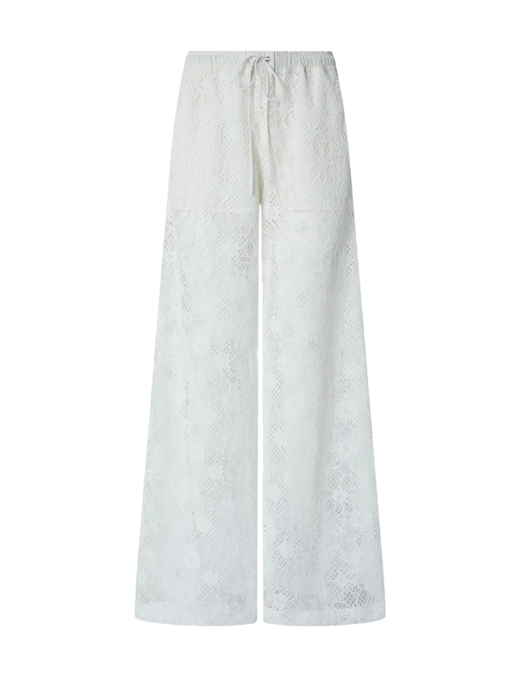Wijdvallende broek van geborduurd kant in pure white. Het bloemenpatroon in het kant geeft de broek een verfijnde textuur, terwijl de rechte, licht uitlopende pijpen zorgen voor een vloeiende lijn. De hoge taille sluit netjes aan op het lichaam. Een broek die zich onderscheidt door het transparante kantwerk met een floraal reliëf.