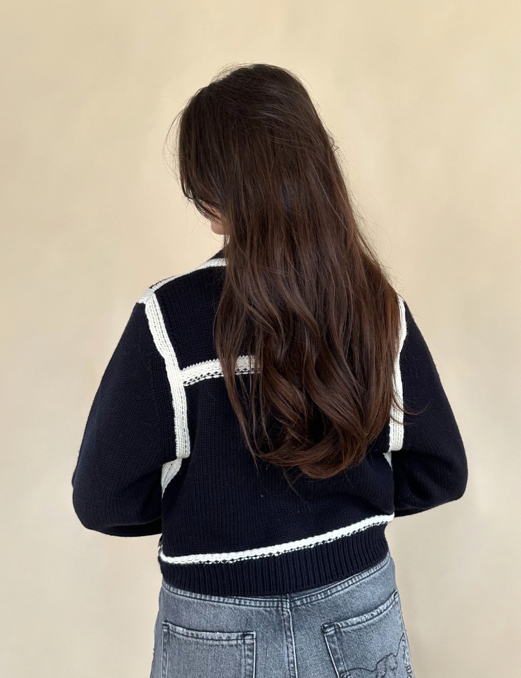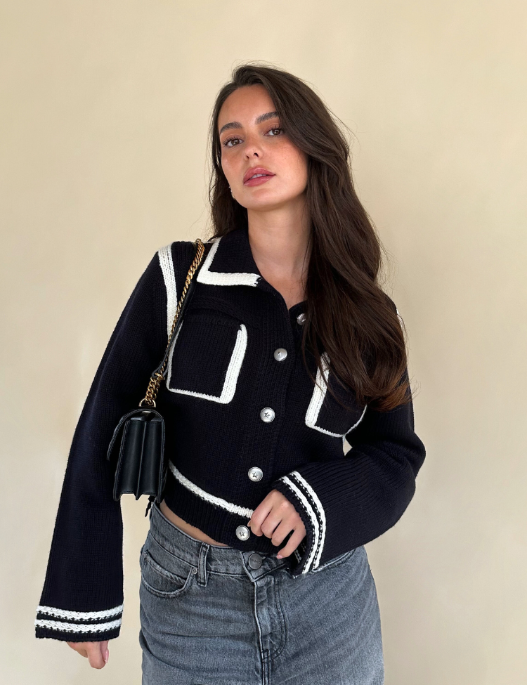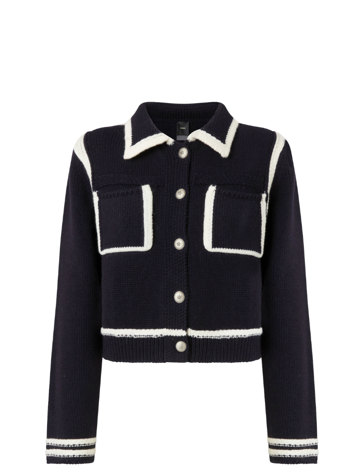 De Pinko Sulcis Cardigan Cordonetto is een tijdloze essential met een moderne twist. Deze cardigan heeft een korte, rechte pasvorm die moeiteloos stijl combineert met draagcomfort. Het hoogwaardige breisel voelt zacht en luxe aan, terwijl de contrasterende biesafwerking langs de kraag, mouwen, zakken en zoom voor een verfijnde, opvallende look zorgt. De knoopsluiting aan de voorzijde is voorzien van stijlvolle knopen met subtiele sterdetails, die een speelse knipoog geven aan het design. Twee opgestikte borstzakken voegen een praktische en modieuze touch toe. Perfect te combineren met een high-waist pantalon voor een chique uitstraling of met een jeans voor een casual-chic look.