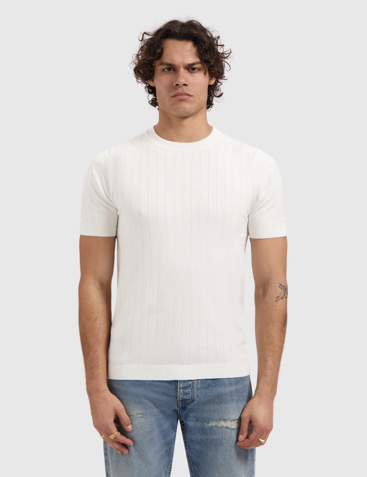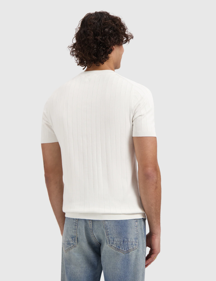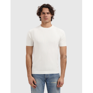 Gebreid t-shirt in off white met een fijne dropneedle structuur. Het shirt heeft korte mouwen, een ronde hals en een zachte, licht gestructureerde afwerking. De relaxte pasvorm zorgt voor een prettige draagbaarheid. Het gebreide materiaal geeft deze basic een verfijnde textuur die verder gaat dan een gewoon katoenen shirt.