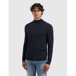 Deze donkerblauwe trui in fijngebreid tricot heeft een mockneck kraag die subtiel omhoog komt. De regular fit valt comfortabel zonder strak aan te sluiten. Geribbelde afwerking bij de kraag, manchetten en zoom zorgt voor stevigheid en een nette afwerking. Het fijne gebreide materiaal geeft een egale, verzorgde look. Op de achterzijde is een klein geborduurd merkdetail verwerkt.