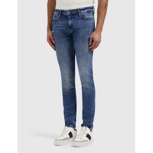Deze skinny fit jeans van Pure Path heeft een donkerblauwe wassing met subtiele slijtage aan de bovenbenen. De spijkerbroek heeft een klassieke vijfzaksindeling met steekzakken voor en achterzakken met contrasterende stiksels. De broek sluit met een knoopsluiting en ritssluiting. De lichte stretch in de denim zorgt voor een comfortabele pasvorm. De smalle pijpen lopen recht naar beneden en eindigen net boven de enkel.
