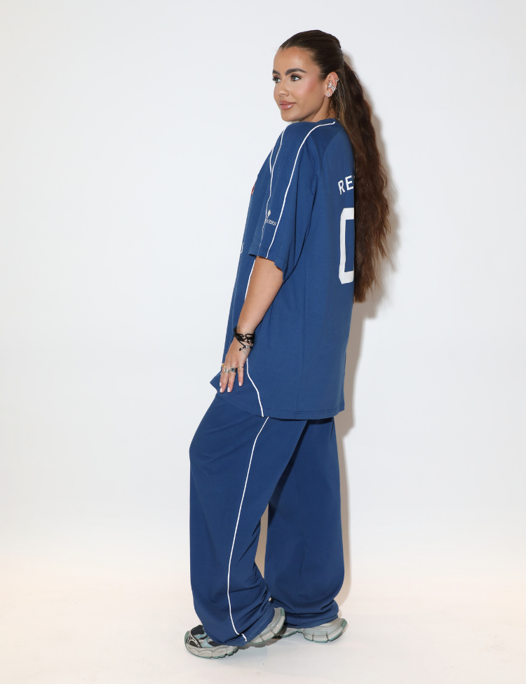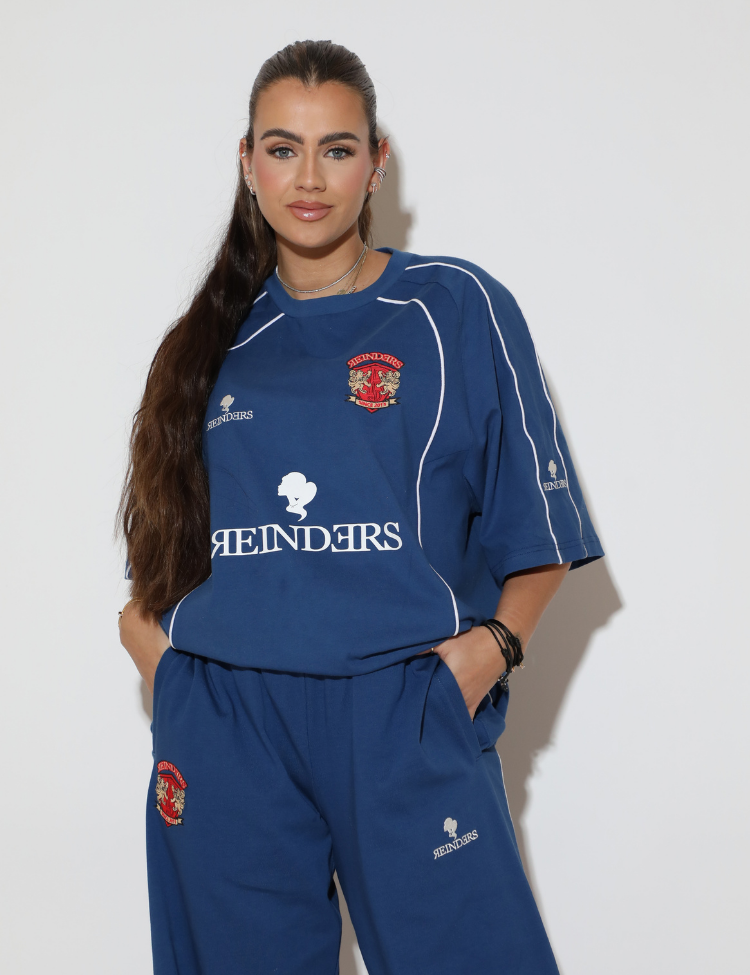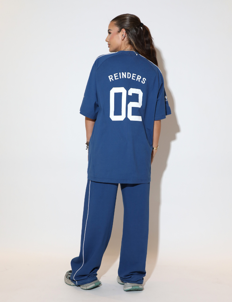 Navy blauwe combi-set bestaande uit een oversized T-shirt en een wijde broek. Het shirt heeft witte paspels langs de naden, een sportief baseball-jersey silhouet en een opvallende backprint met "REINDERS" en het nummer "02" in witte letters. De broek heeft een rechte, wijde pijp met witte paspeldetails aan de zijkant. Beide stukken zijn uitgevoerd in dezelfde navy tint, wat de set een strak geheel maakt.