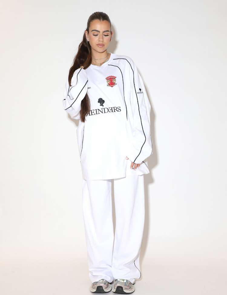 Witte joggingbroek met een rechte, wijde pijp en zwarte biezendetails langs de zijnaden. De broek heeft een sportief silhouet en is voorzien van zijzakken. Op de achterkant zijn zwarte "REINDERS 02" letters zichtbaar, passend bij de voetbalinspired look van het item. De witte kleur en strakke afwerking geven de broek een scherpe uitstraling die verder gaat dan standaard casualwear.
