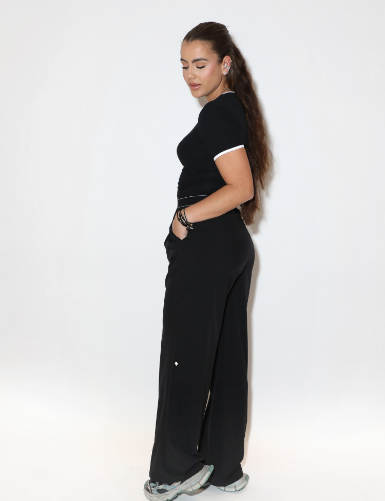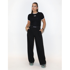 Zwarte wide leg broek van Reinders met een hoge taille en een rechte, wijdvallende pijp die tot op de grond valt. De tailleband heeft een subtiele witte biesdetail die het silhouet accentueert. Op de linkerpijp is een klein geborduurd sterretje zichtbaar. De broek heeft zijzakken en een vloeiende snit die haar vorm goed behoudt.