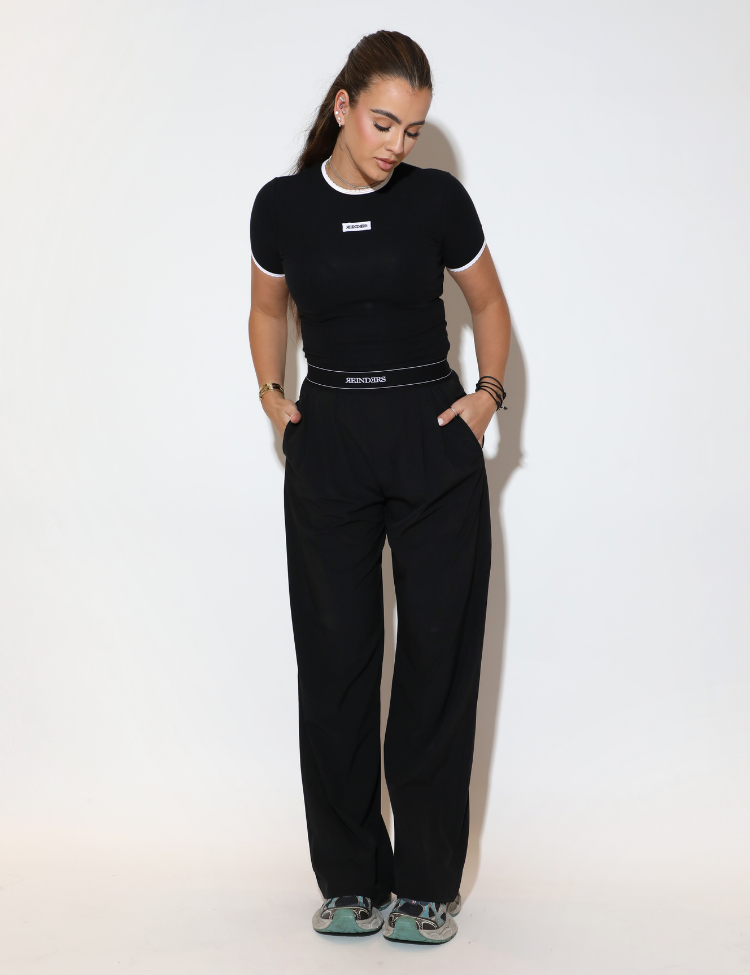 Reinders combineert deze broek met een zwarte, nauwsluitende geribde top met witte biesdetails aan de hals en mouwen.