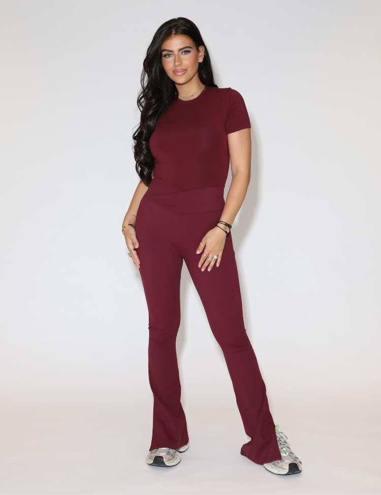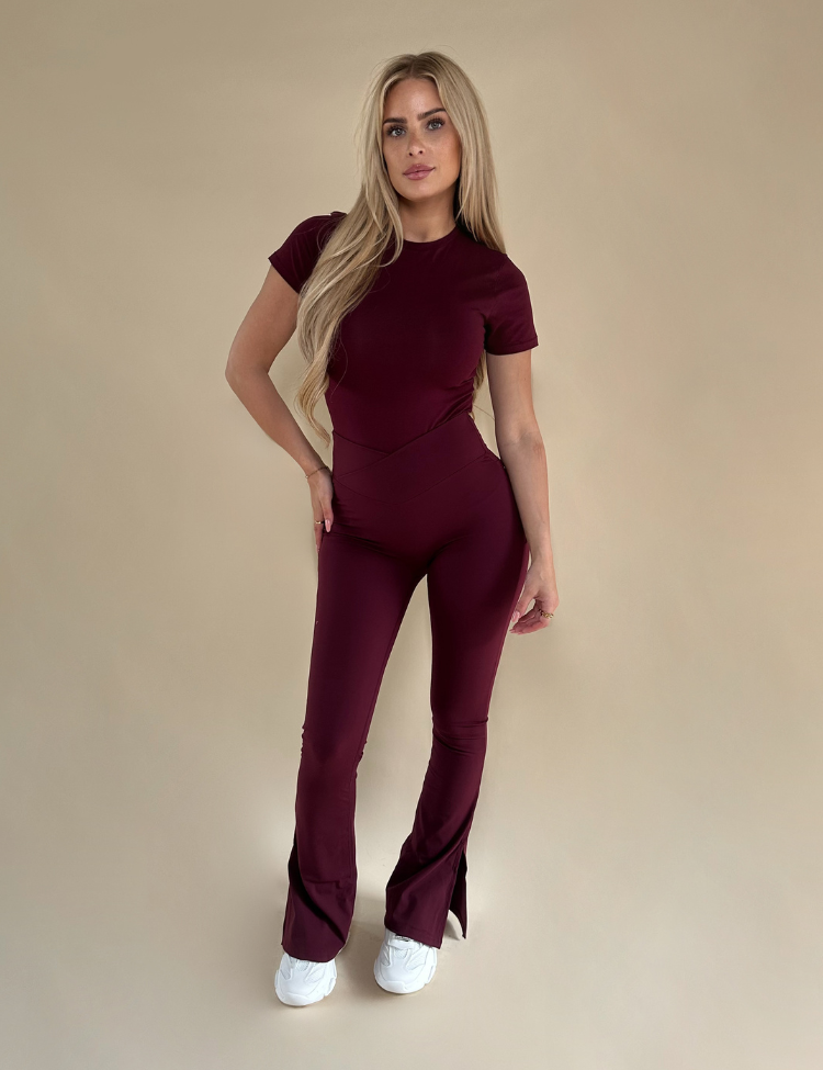 De Soft Cotton Flair Combi-set van Reinders in de kleur Maroon is dé perfecte combinatie van comfort, shaping en stijl. Deze co-ord set bestaat uit een aangesloten T-shirt van zacht katoen met stretch en een bijpassende flared legging met een hoge V-shape tailleband en praktische steekzakken. De diepe bordeauxrode kleur straalt warmte en elegantie uit, terwijl de stretchy stof zorgt voor een flatterende fit die je figuur mooi accentueert. Ideaal als stijlvolle loungewear, voor casual momenten of als comfy airport outfit – deze set is even praktisch als fashionable.