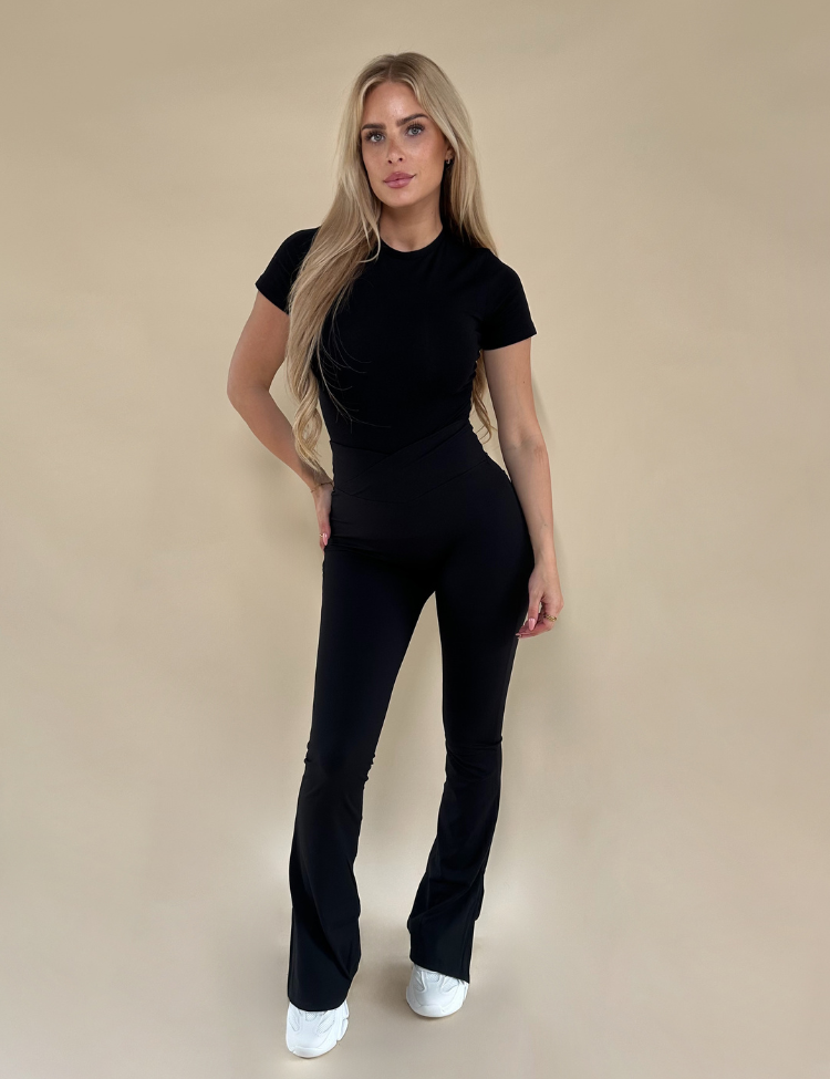 De Soft Cotton Flair Combi-set van Reinders in True Black is de perfecte match van stijl, comfort en kracht. Deze all-black set bestaat uit een aangesloten soft cotton top met korte, lange of mouwloze variant (afhankelijk van jouw voorkeur) en een bijpassende flared legging met high waist en de kenmerkende V-shape tailleband. Gemaakt van een zachte, elastische katoenmix vormt deze set zich perfect naar je lichaam voor een flattering fit. De diepe zwarte kleur geeft de set een minimalistische en krachtige uitstraling, ideaal voor een on-trend casual look, comfy daywear of stylish travel outfit.