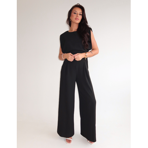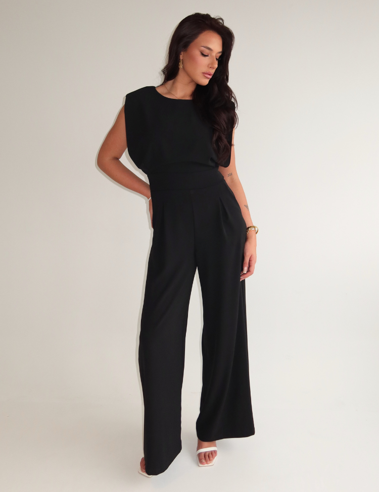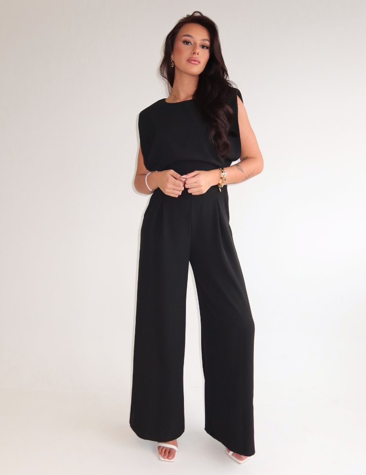 Strakke zwarte jumpsuit met een mouwloos, losjes vallend bovenstuk dat overloopt in een gestructureerde tailleband. Vanaf de taille volgen brede plooien die overgaan in een wijduitlopende broekpijp tot op de grond. De achterkant heeft een verborgen ritssluiting in de nek. Een gave combinatie van volume bovenin en een strakke taille die het silhouet mooi definieert.