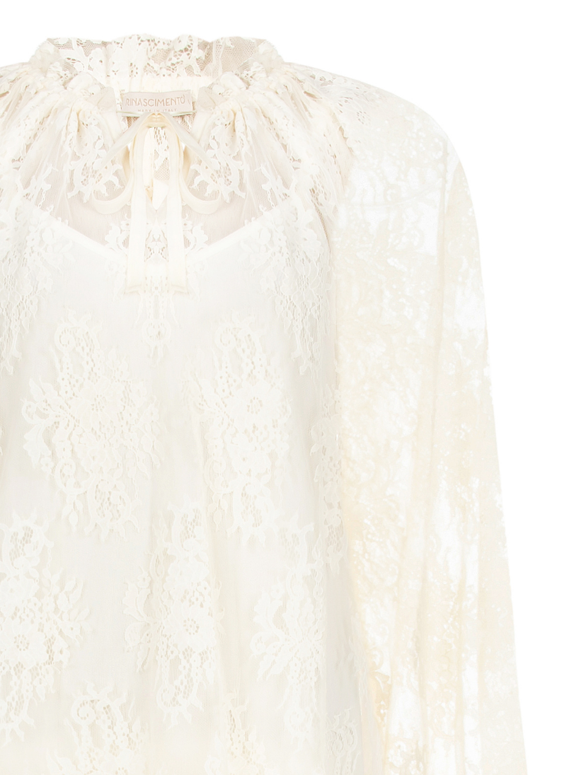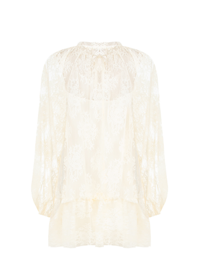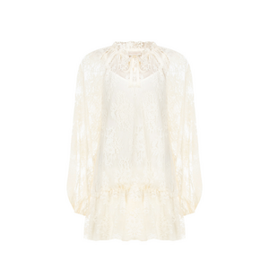 Deze kanten jurk in panna bianco valt op door het delicate bloemendessin en de semi-transparante stof. Het model heeft lange ballonmouwen met elastische manchetten en een hoge, geruchte kraag met strikdetail bij de hals. De jurk heeft een losvallende pasvorm en een lichte A-lijn. Doordat de kanten laag over een voering valt, krijgt het geheel een zacht, gelaagd effect. Het model valt net boven de knie.