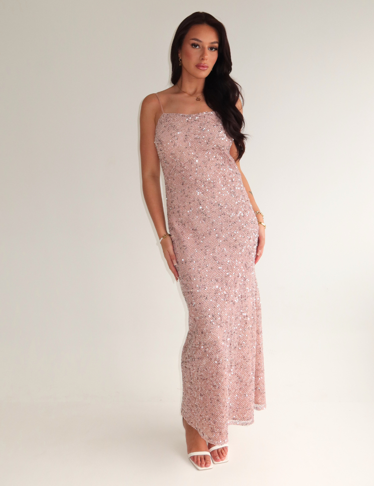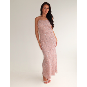 Kleur: Rosa Pastello (roze pastel) Design: Volledig bedekt met pailletten in geometrisch ruitpatroon op mesh ondergrond Lengte: Maxi Artikelnummer: CFC0128155003