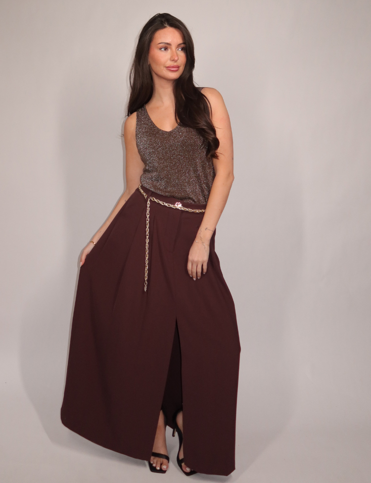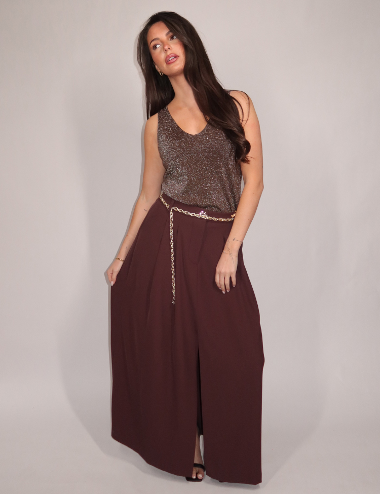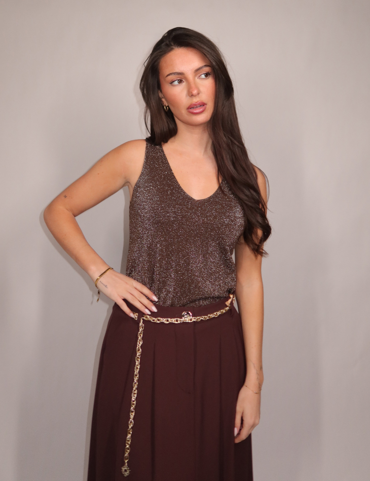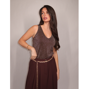 Chocoladebruine mouwloze top met een fijn glitterweefsel dat subtiel oplicht. De V-hals geeft het shirt een open, vrouwelijke uitstraling, terwijl de licht aansluitende snit de taille mooi volgt. Het glanzende effect in de stof zorgt voor een afgewerkte look die overdag én 's avonds werkt. Een veelzijdige canotta die je makkelijk combineert binnen je bestaande garderobe.