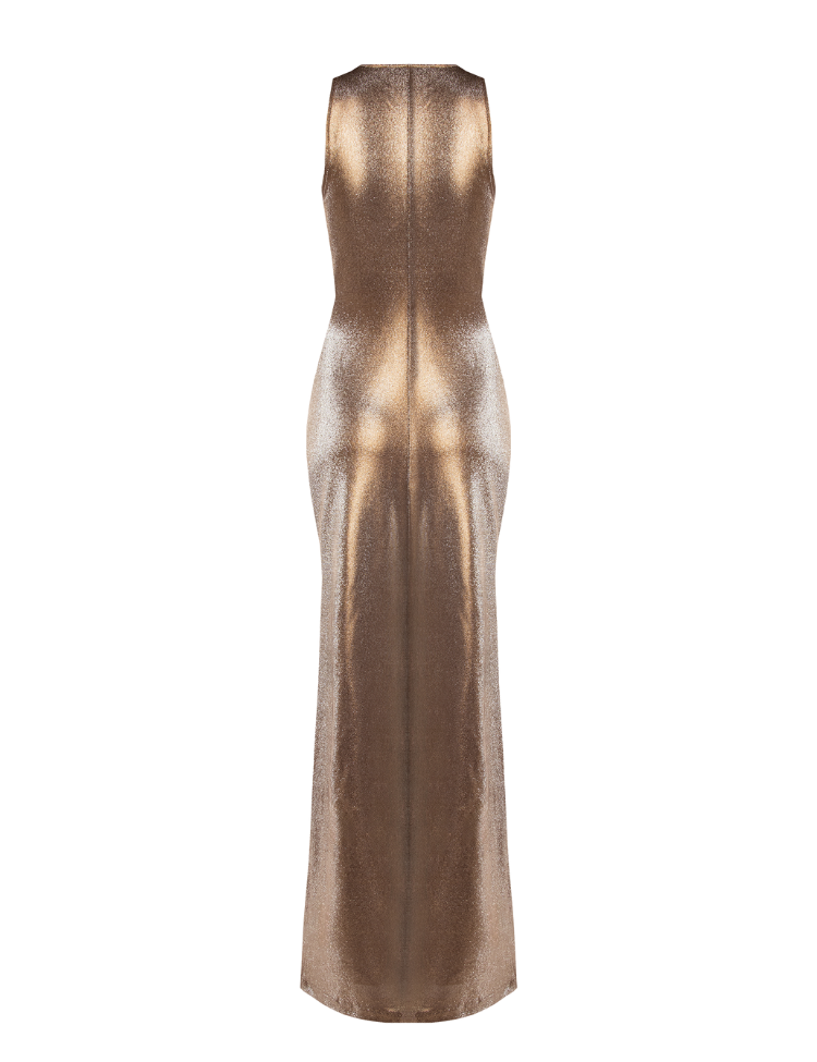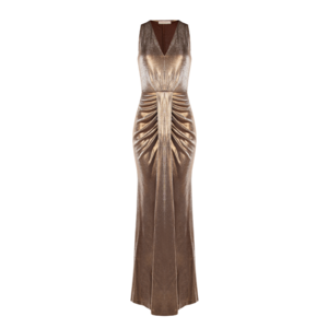 De Rinascimento Baci Adem-P Abi Impero Dress in de kleur Marrone Bronzo is een glamoureuze avondjurk met maximale impact. De lange, mouwloze snit accentueert de vrouwelijke vormen dankzij de elegante V-hals en het flatterende plooidetail bij de taille. De metallic glansstof zorgt voor een sprankelend effect dat perfect is voor feestelijke gelegenheden, gala's of elegante diners. De jurk is uitgevoerd in een comfortabele stretchstof die soepel om het lichaam valt en moeiteloos meebeweegt.