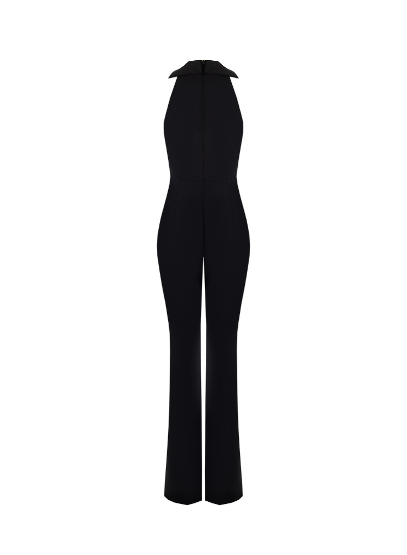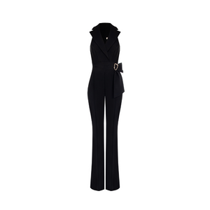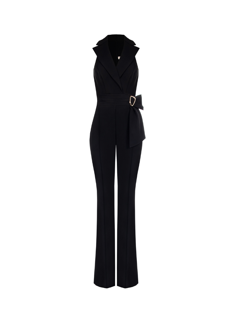 Deze zwarte jumpsuit van Rinascimento heeft een getailleerd silhouet met een halternek en brede kraag. Het model sluit aan bij de taille en loopt uit in een wijde, lange pijp. Een ceintuur met goudkleurige D-ring gesp accentueert de taille. De V-hals aan de voorzijde geeft een vrouwelijke uitstraling. Het bovenstuk heeft structuur door de kraagdetails, terwijl de lange pijpen zakken aan de zijkant hebben. De zwarte kleur maakt dit one-piece veelzijdig en je draagt hem net zo gemakkelijk overdag als 's avonds.
