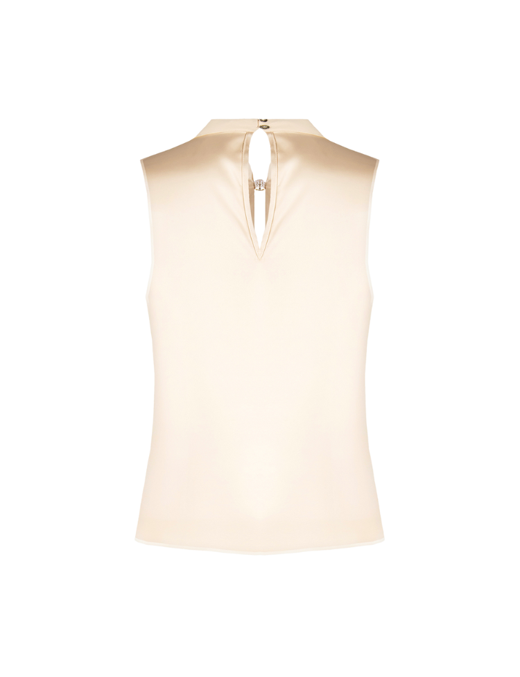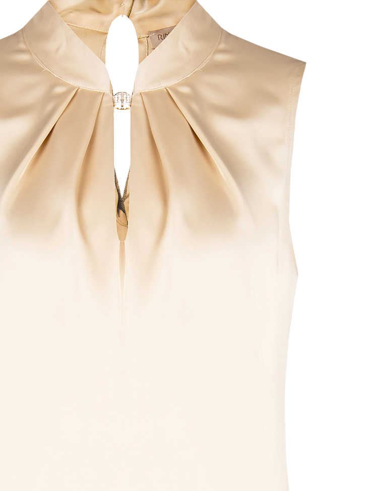 Het design wordt gekenmerkt door een hoge hals met een stijlvolle keyhole-opening aan de voorkant, afgewerkt met een subtiel sierdetail dat een chique touch toevoegt. Deze top combineert moeiteloos vrouwelijkheid met moderne klasse en is geschikt voor zowel zakelijke als feestelijke gelegenheden.