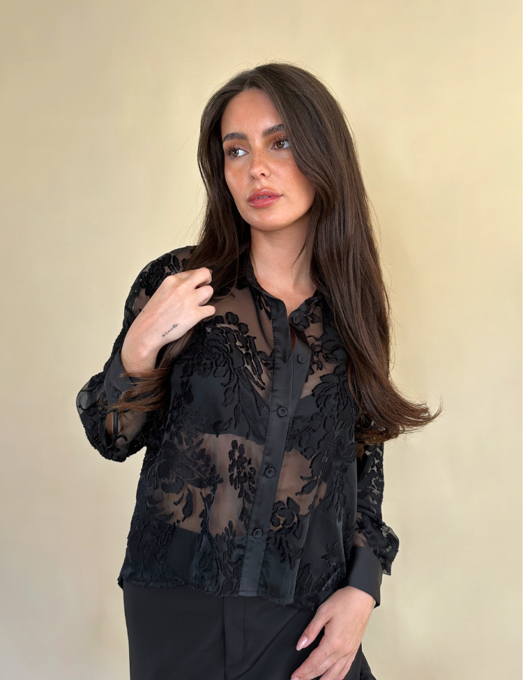 De Gon Cam Blouse van Rinascimento is een verfijnd en verleidelijk ontwerp dat elegantie en sensualiteit moeiteloos combineert. De transparante basis is uitgevoerd in een luchtige mesh met velvet bloemenmotief, waardoor je een subtiel doorschijnend effect krijgt met een rijke textuur. De blouse sluit met knoopjes aan de voorzijde en heeft klassieke manchetten voor een chic silhouet.