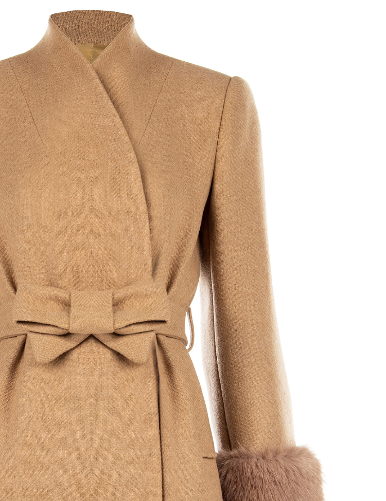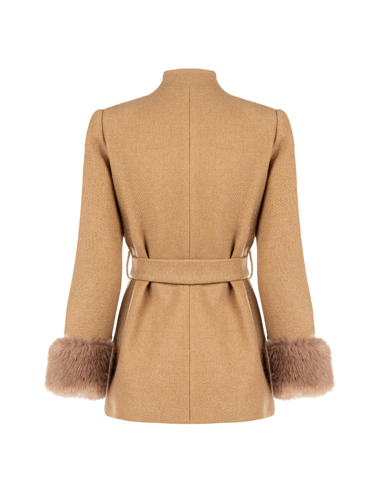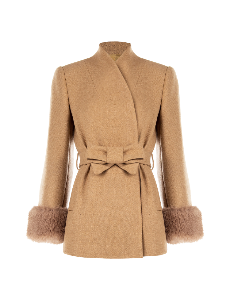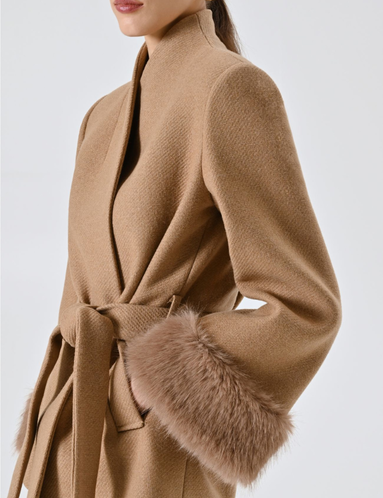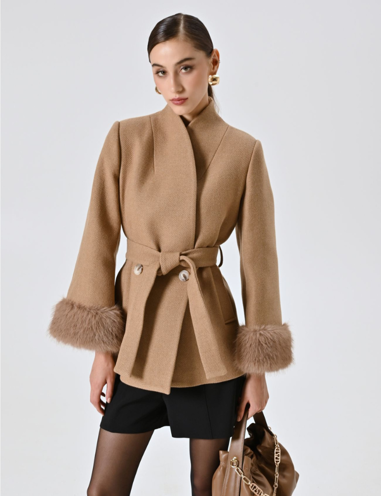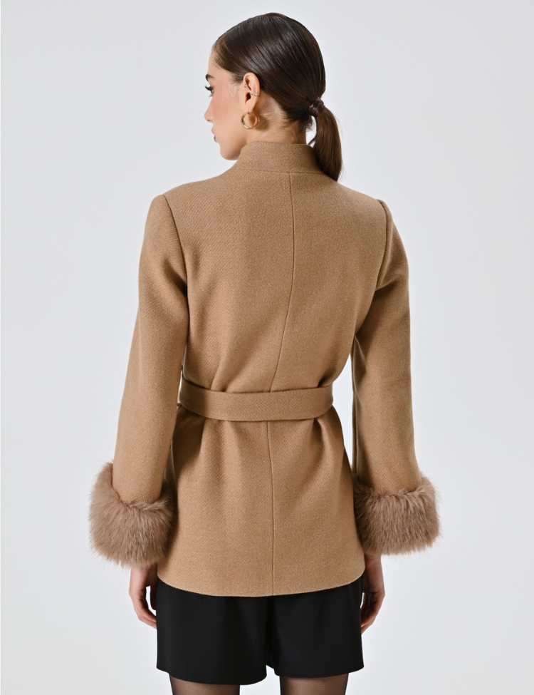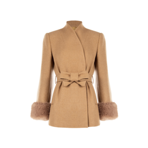 De Rinascimento Capp Jacket is een elegante en vrouwelijke jas die luxe en stijl moeiteloos combineert. Het verfijnde ontwerp heeft een getailleerde pasvorm met een prachtige strikceintuur die het silhouet accentueert. De mouwen zijn afgewerkt met zachte faux fur manchetten, wat zorgt voor een chique en opvallend detail.