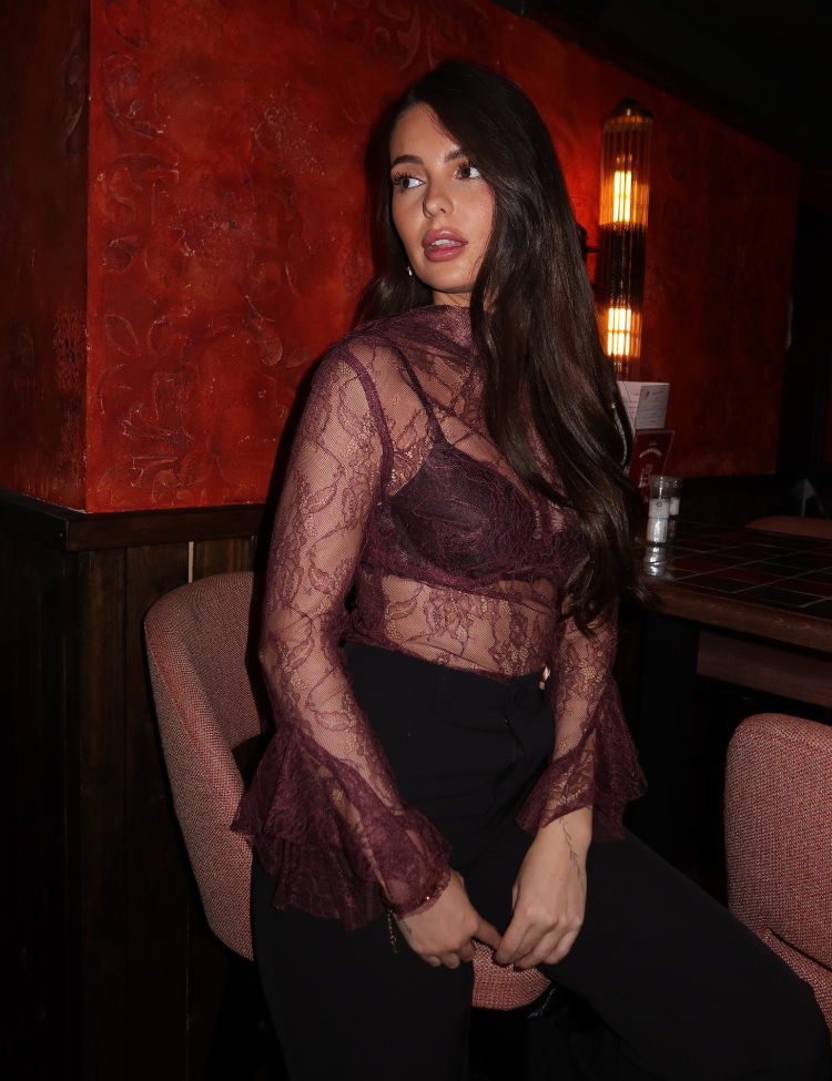De Rinascimento Cose Lupetto Top in cioccolato is een verfijnde en vrouwelijke top gemaakt van transparant kant. Het delicate bloemenkant geeft een elegante en sensuele uitstraling, terwijl de lange mouwen zijn afgewerkt met speelse volantdetails aan de uiteinden. De opstaande kraag en subtiele keyhole-sluiting aan de achterkant maken het ontwerp extra stijlvol.